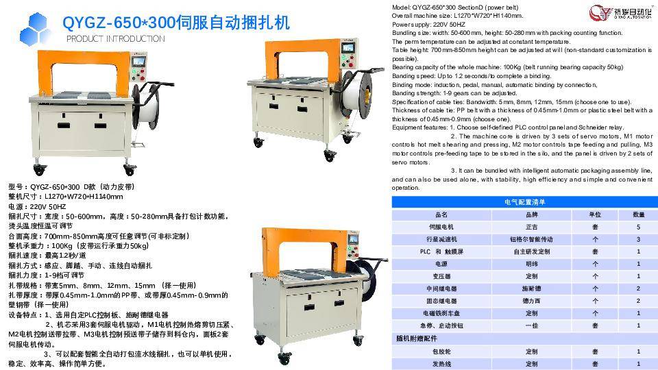 东莞市祈耀自动化设备有限公司的优势体现在研发技术、生产管控与供应链整合三大维度。在研发端,公司每年投入营收的20%用于技术创新,拥有独立的研发中心与实验基地,累计攻克30余项行业技术难题。例如,其研发的“高速带道结构”使捆扎带输送速度提升50%,减少设备停机时间;“自适应捆扎头”可自动识别物料形状并调整捆扎路径,适用性更强。在生产端,公司引入智能化生产线与精益生产管理体系,年产能突破10000台(套),产品不良率低于0.5%。在供应链端,公司与正吉(伺服电机)、施耐德(继电器)、德力西(固态继电器)等国际知名供应商建立长期合作,确保核心部件品质稳定。例如,QYGZ系列采用的伺服电机寿命达10万小时,较普通电机提升3倍,明显降低设备维护成本。